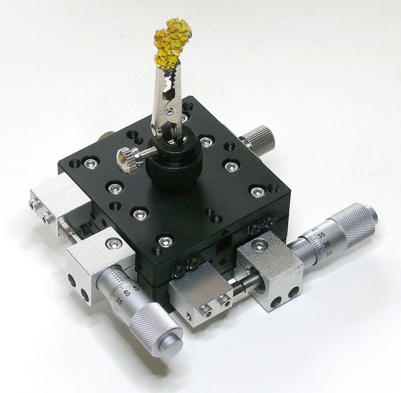 A top quality micrometer precision X,Y stage that can sit easily onto the UM1004 stand and on most other stands. The stage can be used to mount a specimen/specimen holder, the ideal manual system for positioning and gathering a stack of images of subjects at high magnification. Using it to mount a specimen with the supplied rotatable crocodile clip is its most common usage. Knobs control the X and Y movement of up to 13mm in each axis. The movements have graduated scales on the micrometer knobs so you can make extremely precise interval movements.