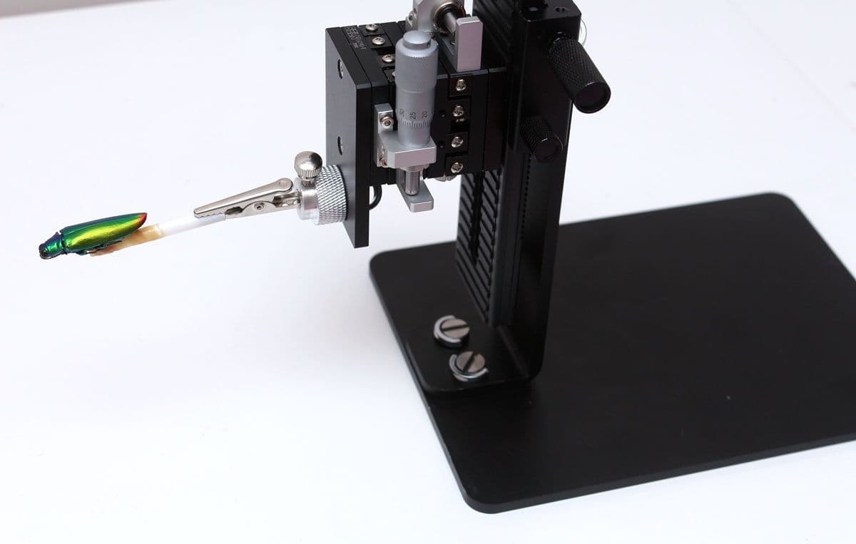 This can be mounted to any tripod, macro rail or macro stand system. It provides extremely fine control over the specimen position. Ideal for manual focus stacking and you can also record stop/snap movement sequences.