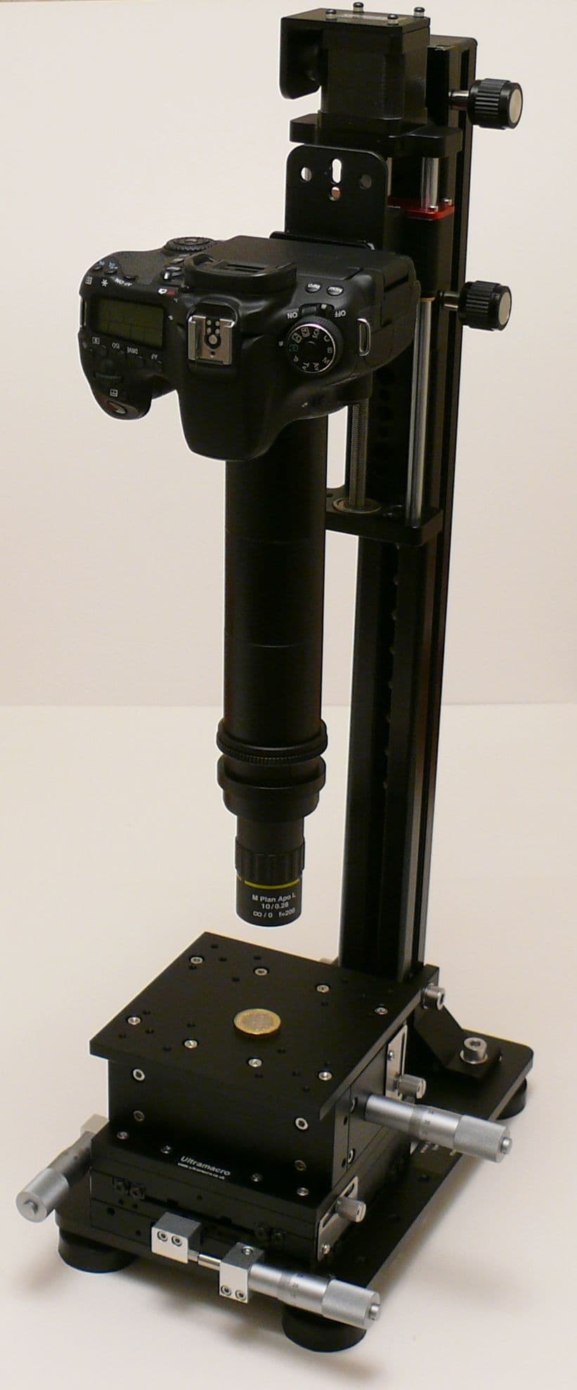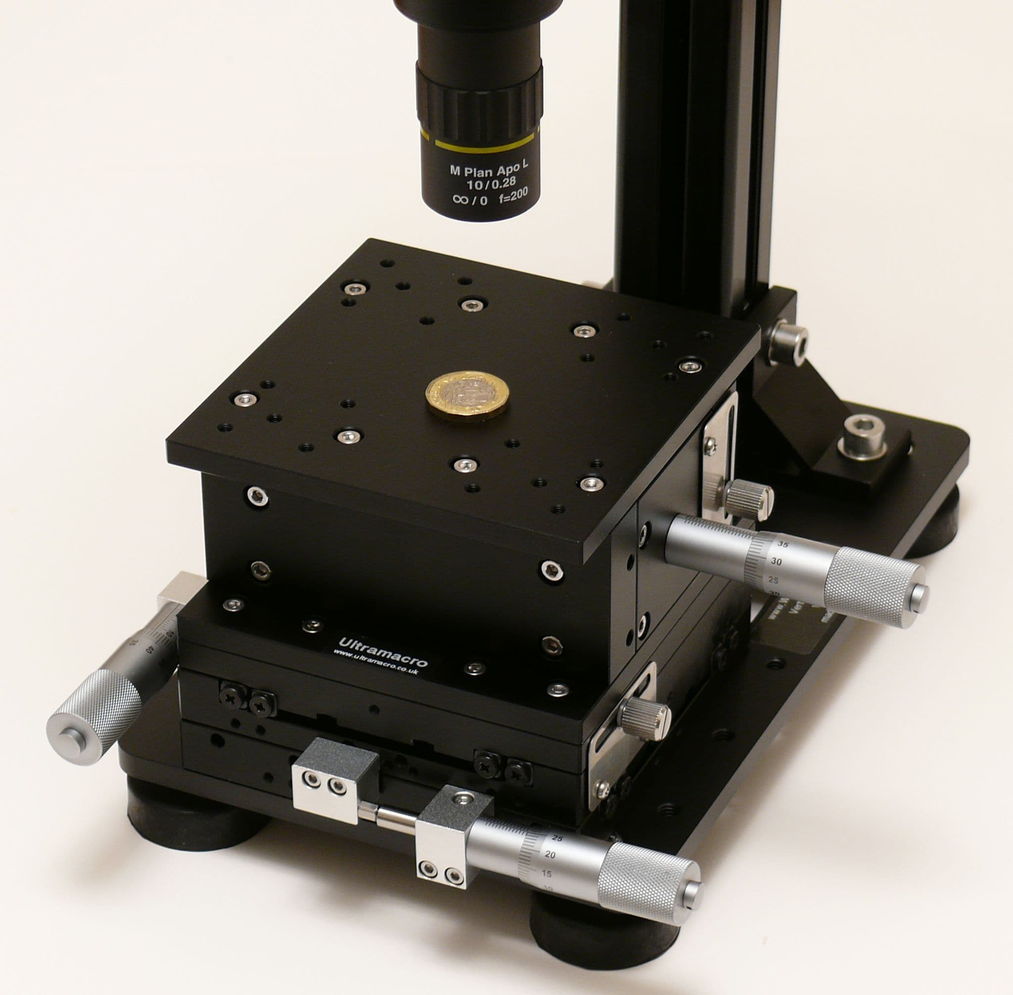 A top quality large micrometer precision X,Y and Z-height adjustable stage that can sit easily onto the UM1004 stand and on most other stands. The stage can be used to mount a specimen/specimen holder, the ideal manual system for positioning and gathering a stack of images of subjects at high magnification. Using it to mount a specimen using the supplied rotatable crocodile clip is its most common usage. It has 10 mm of vertical travel, the height being controlled by turning a fine micrometer knob with an additional knob which can be tightened to lock the position. Also there are similar knobs to control the X and Y movement of up to 25mm in each axis. The movements have graduated scales on the micrometer knobs so you can make extremely precise interval movements.