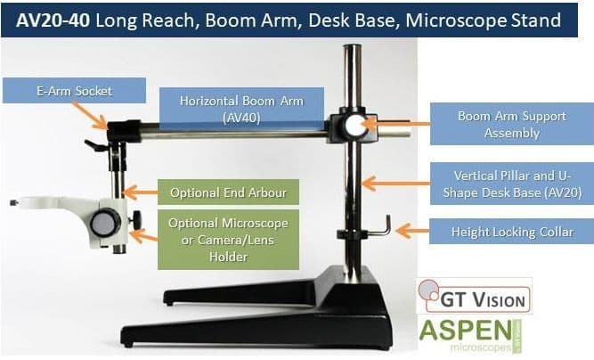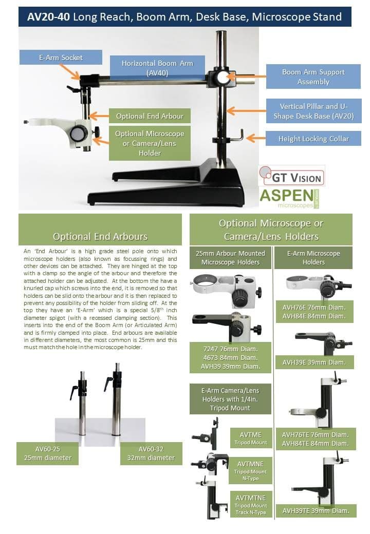 An ‘End Arbour’ is a high grade steel pole onto which microscope holders (also known as focussing rings) and other devices can be attached. They are hinged at the top with a clamp so the angle of the arbour and therefore the attached holder can be adjusted. At the bottom the have a knurled cap which screws into the end, it is removed so that holders can be slid onto the arbour and it is then replaced to prevent any possibility of the holder from sliding off. At the top they have an ‘E-Arm’ which is a special 5/8th inch diameter spigot (with a recessed clamping section). This inserts into the end of the Boom Arm (or Articulated Arm) and is firmly clamped into place. End arbours are available in different diameters, the most common is 25mm and this must match the hole in the microscope holder.
