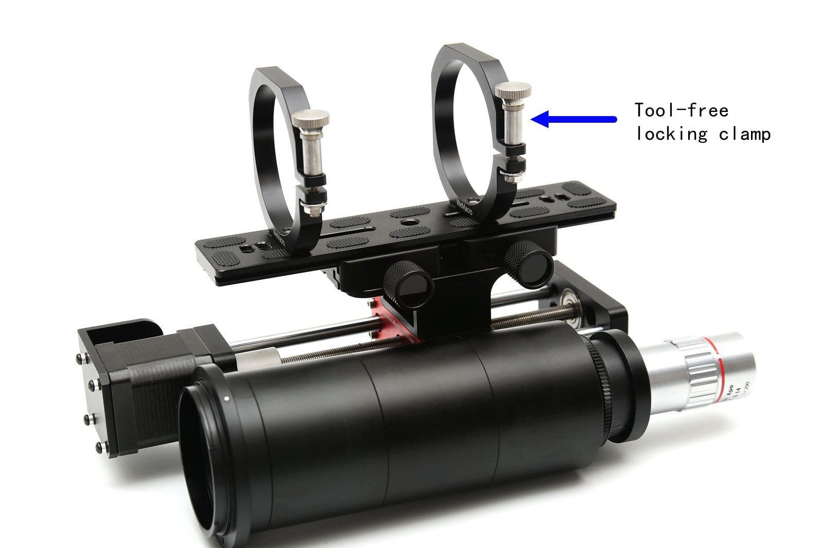 Two independent quick-release clamp are installed along the central axis to ensure that the direction of the optical axis of the tube lens is consistent with the advancing direction of the rail.
