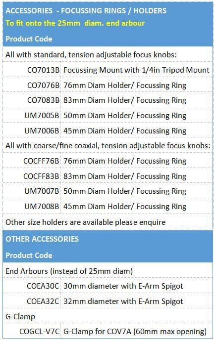 The ‘end arbour’ is the short pillar at the end of the arm onto which various focussing rings and mounts can be attached as shown. The end arbour has an adjustable clamping mount so any angle can be selected. The end arbour as standard is 25mm in diameter but additional end arbours with 30mm and 32mm diameters are available. The end arbours are secured into the ends of the arms with an ‘E-Arm’ spigot which is then locked into place.